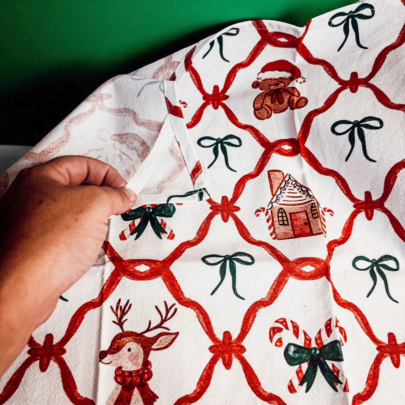 Looks like someone couldn't decide between Santa, gingerbread houses, teddy bears, reindeer, candy canes, and Christmas trees - so we said "why not ALL of them?" Our vintage Christmas variety kitchen towel is basically like having a Christmas museum right in your kitchen, complete with red ribbon lattice framing because even holiday chaos needs to look organized.