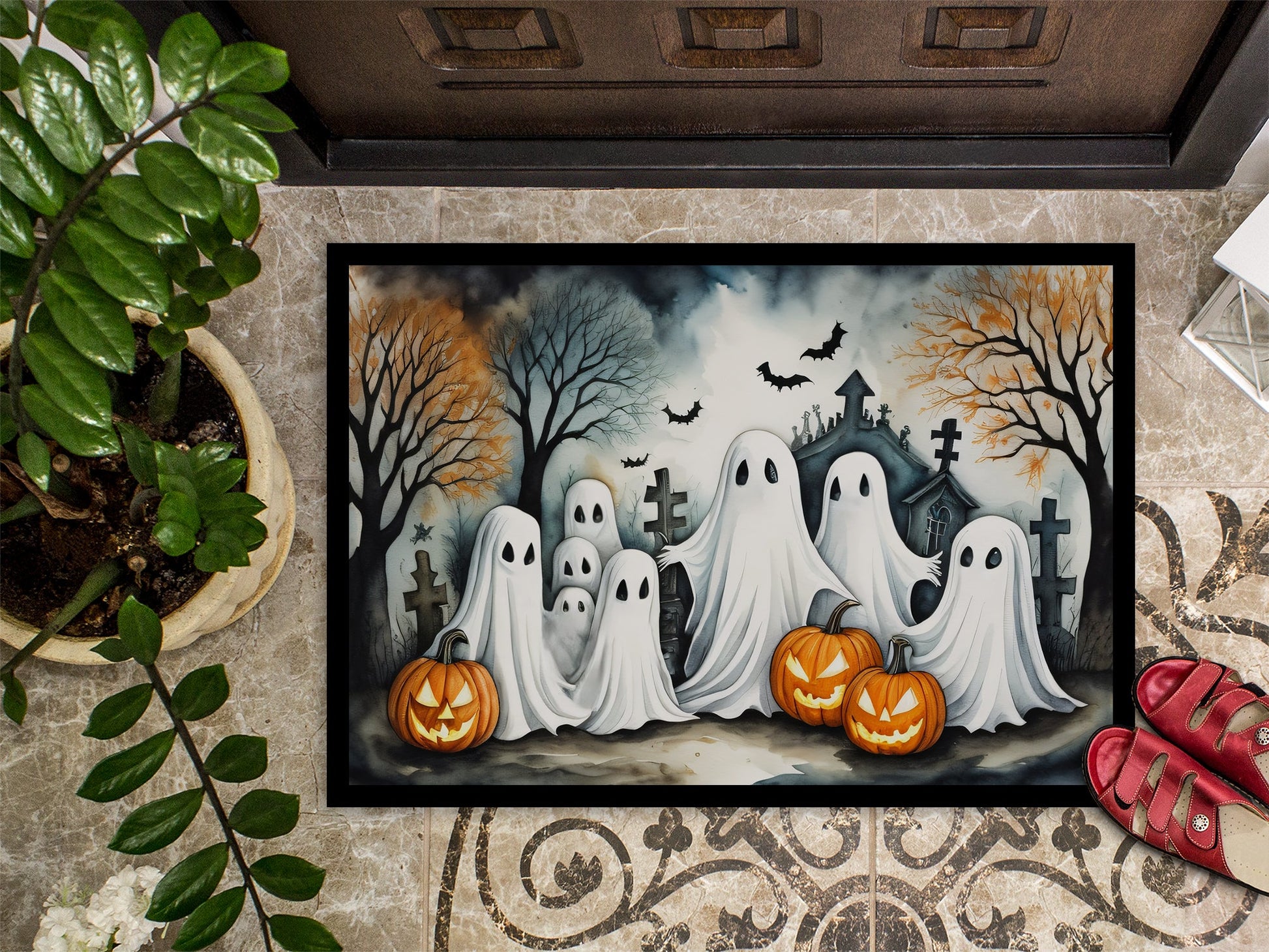 Celebrate Halloween with this Halloween Doormat. Welcome your guests in style with our Artwork Door Mat, designed to withstand almost any weather condition. This mat, measuring approximately 24 by 36 inches, is held together by durable black binding tape. Its top layer, composed of polyester felt, is dyed with the eye-catching image you see on the mat. A few layers below provide the mat with stability, while its rubber bottom is stamped to help prevent slipping and ensures safety. Our mat works wonderfully as both an indoor or outdoor door mat. For cleaning, simply hose it off with water or use a power washer - no need for any cleaner that produces suds. Avoid scrubbing with a brush, instead, opt for the vacuum on floor setting. Designed manufactured and printed in the USA, this mat is a perfect addition to your porch, outdoor kitchen, entryway, or any indoor space. Its unique design makes it a charming decorative rug that greets your guests and adds a stylish touch to your home decor.