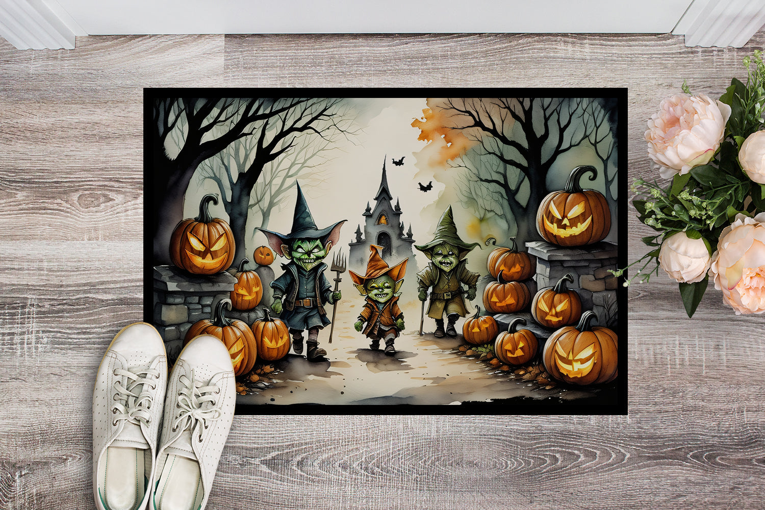 Celebrate Halloween with this Halloween Doormat. Welcome your guests in style with our Artwork Door Mat, designed to withstand almost any weather condition. This mat, measuring approximately 24 by 36 inches, is held together by durable black binding tape. Its top layer, composed of polyester felt, is dyed with the eye-catching image you see on the mat. A few layers below provide the mat with stability, while its rubber bottom is stamped to help prevent slipping and ensures safety. Our mat works wonderfully as both an indoor or outdoor door mat. For cleaning, simply hose it off with water or use a power washer - no need for any cleaner that produces suds. Avoid scrubbing with a brush, instead, opt for the vacuum on floor setting. Designed manufactured and printed in the USA, this mat is a perfect addition to your porch, outdoor kitchen, entryway, or any indoor space. Its unique design makes it a charming decorative rug that greets your guests and adds a stylish touch to your home decor.