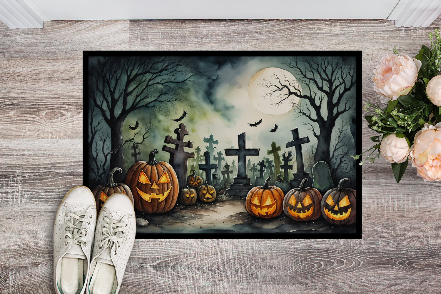 Celebrate Halloween with this Halloween Doormat. Welcome your guests in style with our Artwork Door Mat, designed to withstand almost any weather condition. This mat, measuring approximately 18 by 27 inches, is held together by durable black binding tape. Its top layer, composed of polyester felt, is dyed with the eye-catching image you see on the mat. A few layers below provide the mat with stability, while its rubber bottom is stamped to help prevent slipping and ensures safety. Our mat works wonderfully as both an indoor or outdoor door mat. For cleaning, simply hose it off with water or use a power washer - no need for any cleaner that produces suds. Avoid scrubbing with a brush, instead, opt for the vacuum on floor setting. Designed manufactured and printed in the USA, this mat is a perfect addition to your porch, outdoor kitchen, entryway, or any indoor space. Its unique design makes it a charming decorative rug that greets your guests and adds a stylish touch to your home decor.