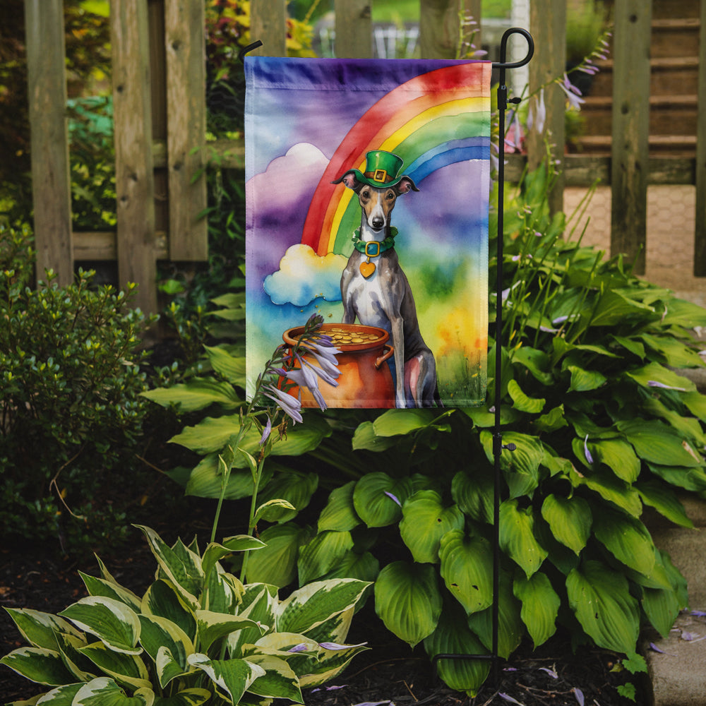 Garden Flag featuring breed specific Greyhound artwork. Celebrate St Patrick's Day with this St Patrick's Day Garden Flag. Enhance the beauty of your garden, patio, or yard with Caroline's Treasures Decorative Garden Flag, proudly made in the USA. Crafted from two pieces of thick, double-sided polyester fabric, this 2-ply garden flag is designed to withstand various weather conditions, making it water-resistant and weatherproof. Featuring correctly readable words on both sides, this garden flag offers a delightful visual experience from any angle. With its heavier weight, it stands out among other garden flags, ensuring stability and durability even in wind, rain, and snow. Measuring approximately 11 1/4 inches by 15 1/2 inches, this flag allows you to personalize your outdoor decor. It comes with a 1 1/2-inch sleeve sewn in, allowing easy attachment to any standard garden flag stand or garden size porch hanger (sold separately). Make a statement in your outdoor space with Caroline's Treasures Decorative Garden Flag, a vibrant and high-quality flag that adds color and personality to your surroundings. Proudly made in the USA, it's a symbol of quality craftsmanship and attention to detail.