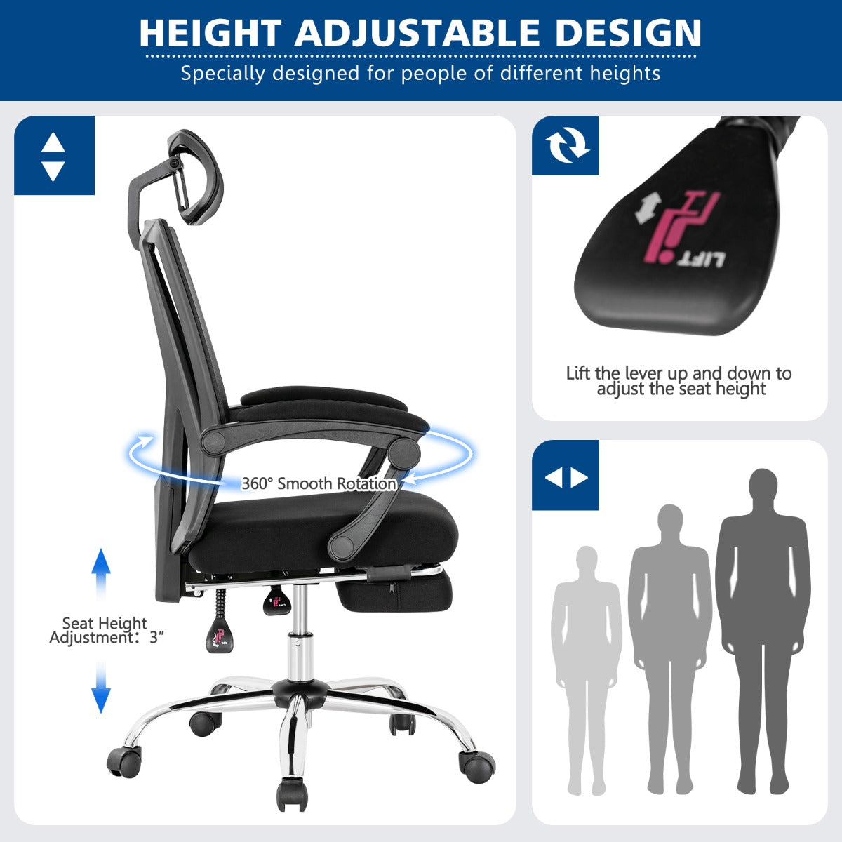 Our recliner office chair is aimed at alleviating spine pressure and improving work efficiency. The inclination of the backrest (90°-135°) lets you adjust it to suit your different needs. You can adjust the seat to your desired height for a comfortable position. More, there is a retractable footrest, which helps rest your tired feet. The 2D headrest with height and angle adjustable design can extremely relax your stiff neck. Plus, mesh backrest keeps air circulation and ergonomic lumbar support supports your waist for a comfortable sitting experience. The wide padded seat lets you stay away from the numbness in the long working day. Heavy-duty base and superior gas lift make it more stable and safe for long-service life. Thanks to the flexible casters and 360° swivel seat, you can easily move around and get higher relaxation.
