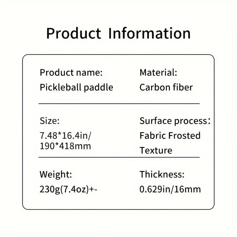 Description: Elevate your pickleball experience with our Carbon Fiber T700 Pickleball Paddle, engineered for ultimate performance on the court. Crafted from premium T700 carbon fiber material, this paddle combines lightweight durability with superior strength, ensuring it can withstand the toughest matches. The rough texture of the paddle's surface enhances grip and spin control, allowing you to execute precise shots with ease. Approved by USA Pickleball, this paddle meets the highest standards of quality and performance, making it a trusted choice for competitive players. Whether you're a seasoned pro or just starting out, the unisex design and 16mm thickness ensure this paddle is suitable for players of all ages and skill levels. Dominate the game with confidence using our Carbon Fiber T700 Pickleball Paddle.
