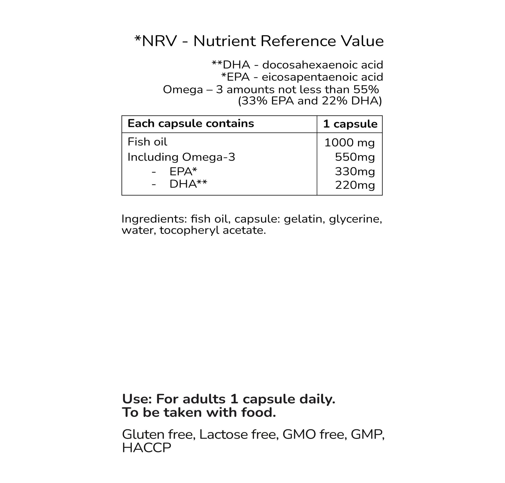 Ingredients: fish oil, capsule: gelatin, glycerine, water, tocopheryl acetate.