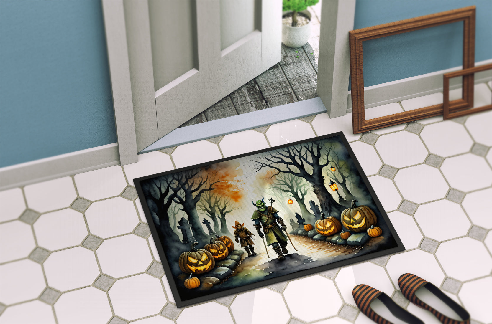 Celebrate Halloween with this Halloween Doormat. Welcome your guests in style with our Artwork Door Mat, designed to withstand almost any weather condition. This mat, measuring approximately 18 by 27 inches, is held together by durable black binding tape. Its top layer, composed of polyester felt, is dyed with the eye-catching image you see on the mat. A few layers below provide the mat with stability, while its rubber bottom is stamped to help prevent slipping and ensures safety. Our mat works wonderfully as both an indoor or outdoor door mat. For cleaning, simply hose it off with water or use a power washer - no need for any cleaner that produces suds. Avoid scrubbing with a brush, instead, opt for the vacuum on floor setting. Designed manufactured and printed in the USA, this mat is a perfect addition to your porch, outdoor kitchen, entryway, or any indoor space. Its unique design makes it a charming decorative rug that greets your guests and adds a stylish touch to your home decor.
