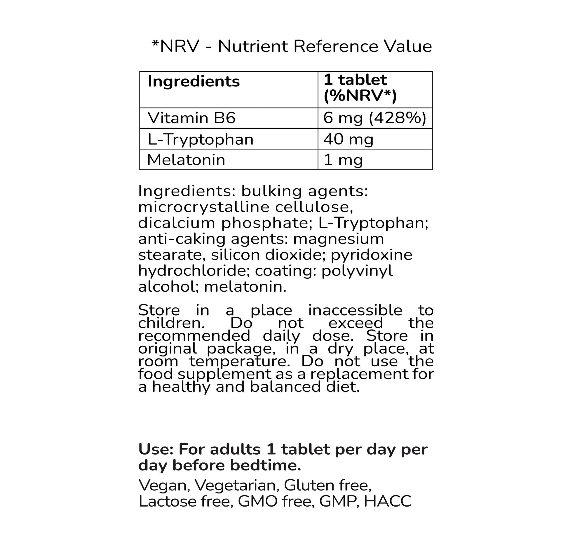 Ingredients: bulking agents: microcrystalline cellulose, dicalcium phosphate; L-Tryptophan; anti-caking agents: magnesium stearate, silicon dioxide; pyridoxine hydrochloride; coating: polyvinyl alcohol; melatonin.