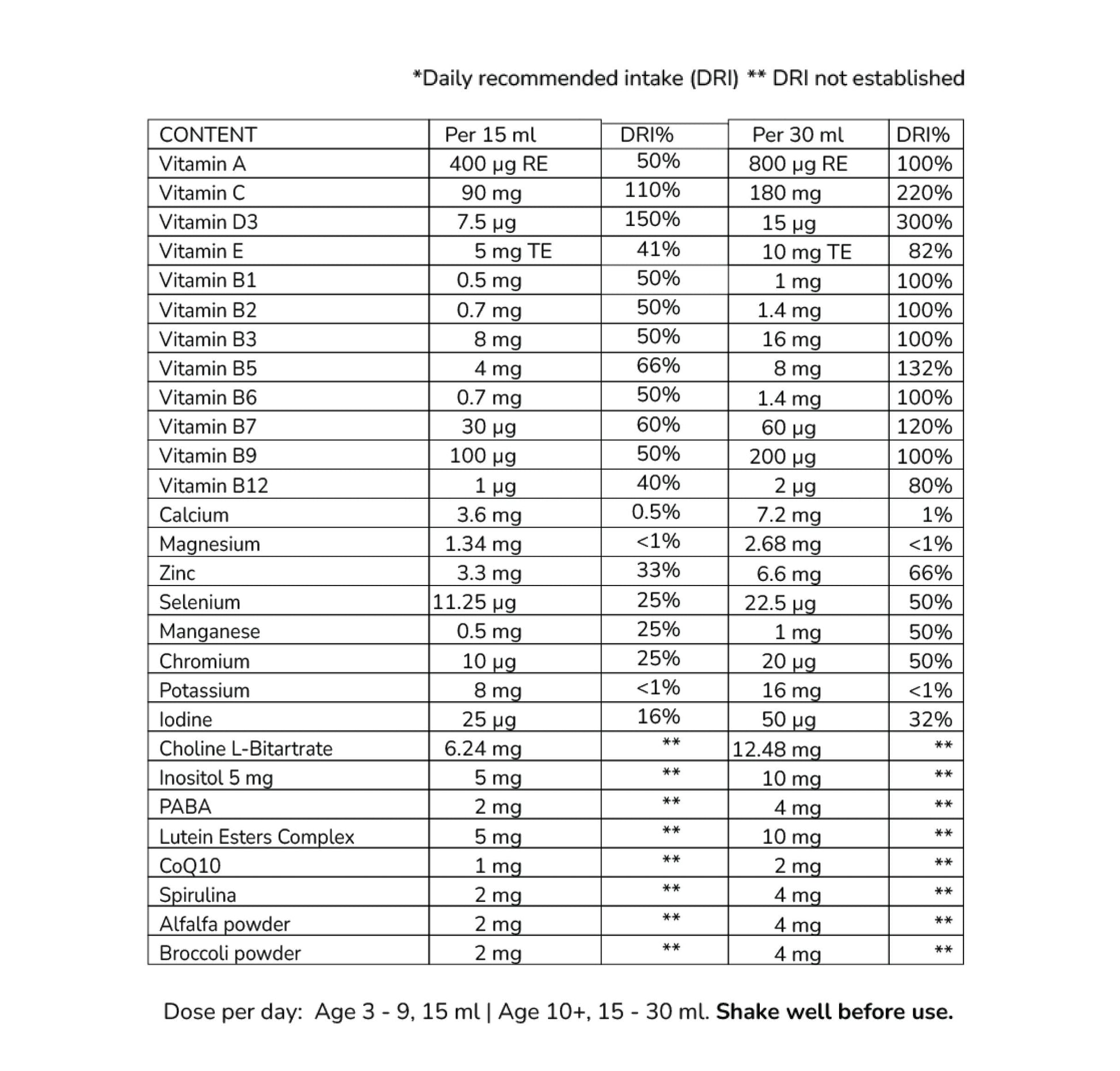 *DDosDose per day: Age 3 - 9, 15 ml | Age 10+, 15 - 30 ml. Shake well before use.