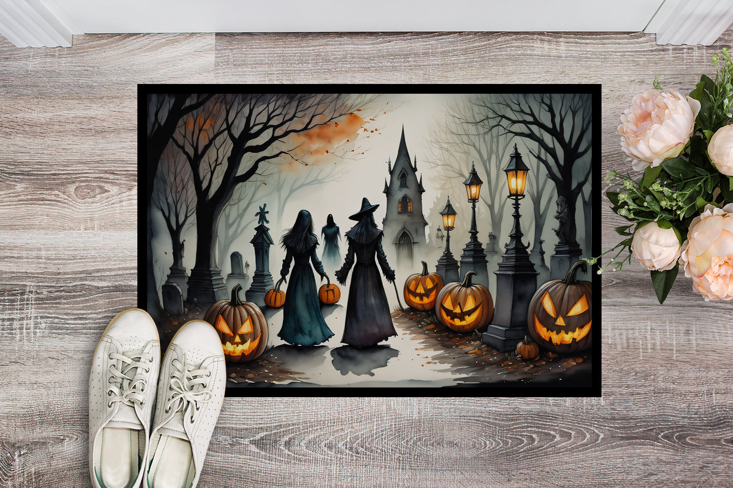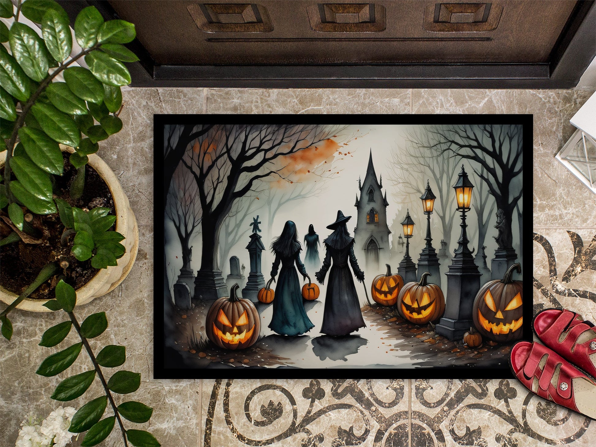 Celebrate Halloween with this Halloween Doormat. Welcome your guests in style with our Artwork Door Mat, designed to withstand almost any weather condition. This mat, measuring approximately 24 by 36 inches, is held together by durable black binding tape. Its top layer, composed of polyester felt, is dyed with the eye-catching image you see on the mat. A few layers below provide the mat with stability, while its rubber bottom is stamped to help prevent slipping and ensures safety. Our mat works wonderfully as both an indoor or outdoor door mat. For cleaning, simply hose it off with water or use a power washer - no need for any cleaner that produces suds. Avoid scrubbing with a brush, instead, opt for the vacuum on floor setting. Designed manufactured and printed in the USA, this mat is a perfect addition to your porch, outdoor kitchen, entryway, or any indoor space. Its unique design makes it a charming decorative rug that greets your guests and adds a stylish touch to your home decor.