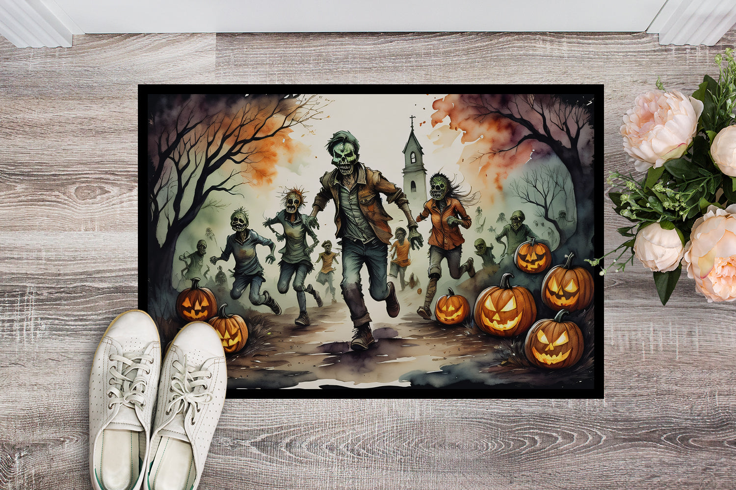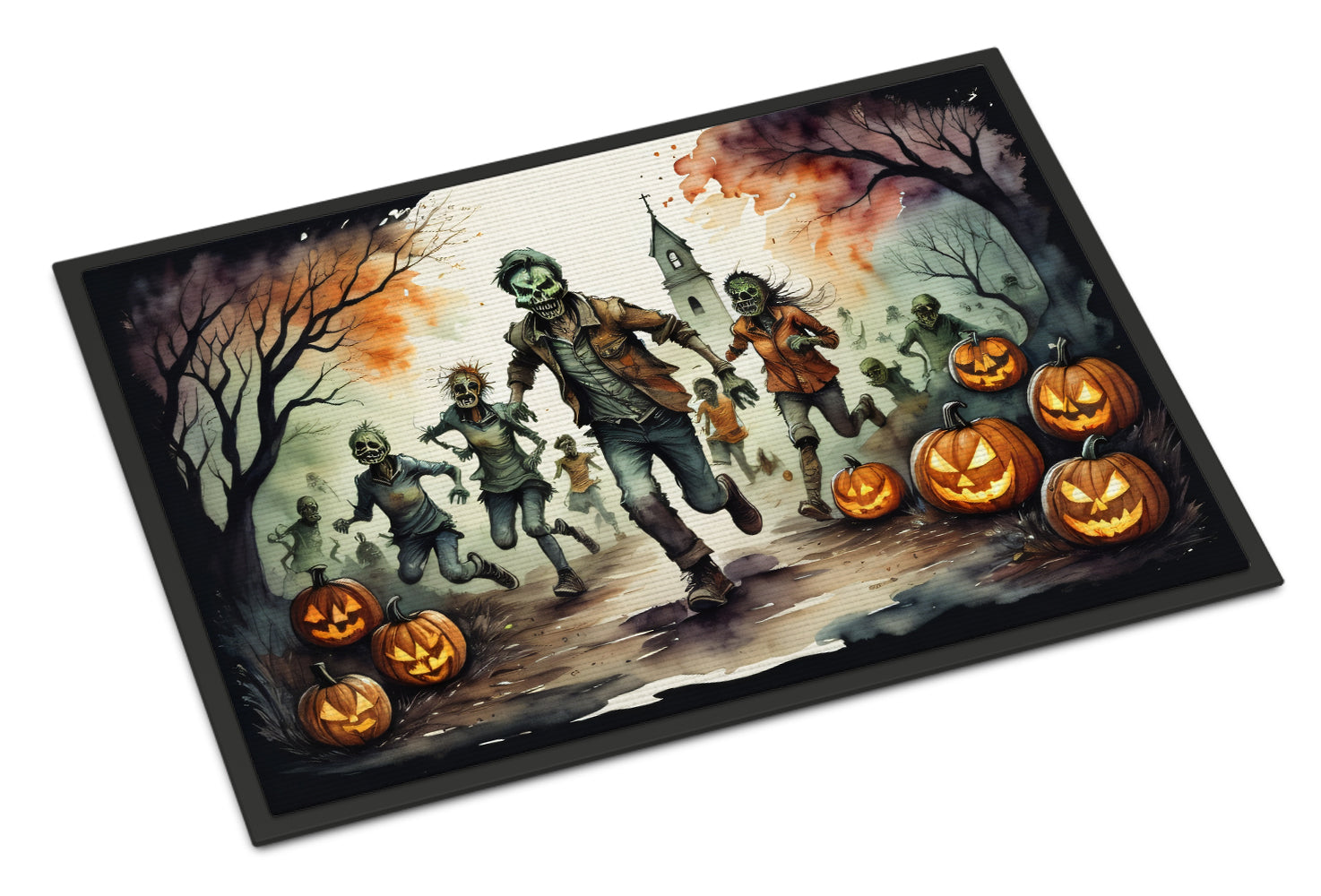 Celebrate Halloween with this Halloween Doormat. Welcome your guests in style with our Artwork Door Mat, designed to withstand almost any weather condition. This mat, measuring approximately 24 by 36 inches, is held together by durable black binding tape. Its top layer, composed of polyester felt, is dyed with the eye-catching image you see on the mat. A few layers below provide the mat with stability, while its rubber bottom is stamped to help prevent slipping and ensures safety. Our mat works wonderfully as both an indoor or outdoor door mat. For cleaning, simply hose it off with water or use a power washer - no need for any cleaner that produces suds. Avoid scrubbing with a brush, instead, opt for the vacuum on floor setting. Designed manufactured and printed in the USA, this mat is a perfect addition to your porch, outdoor kitchen, entryway, or any indoor space. Its unique design makes it a charming decorative rug that greets your guests and adds a stylish touch to your home decor.